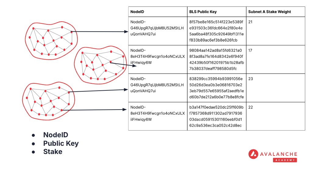 Each Avalanche validator can register a BLS public key alongside its NodeID on the Avalanche P-Chain. Validators of Avalanche L1s can stake different amounts of the Avalanche L1's staking token. Through the P-Chain, we can determine a weighted set of BLS Public Keys that correspond to the validators of each Avalanche L1 on the Avalanche Network.